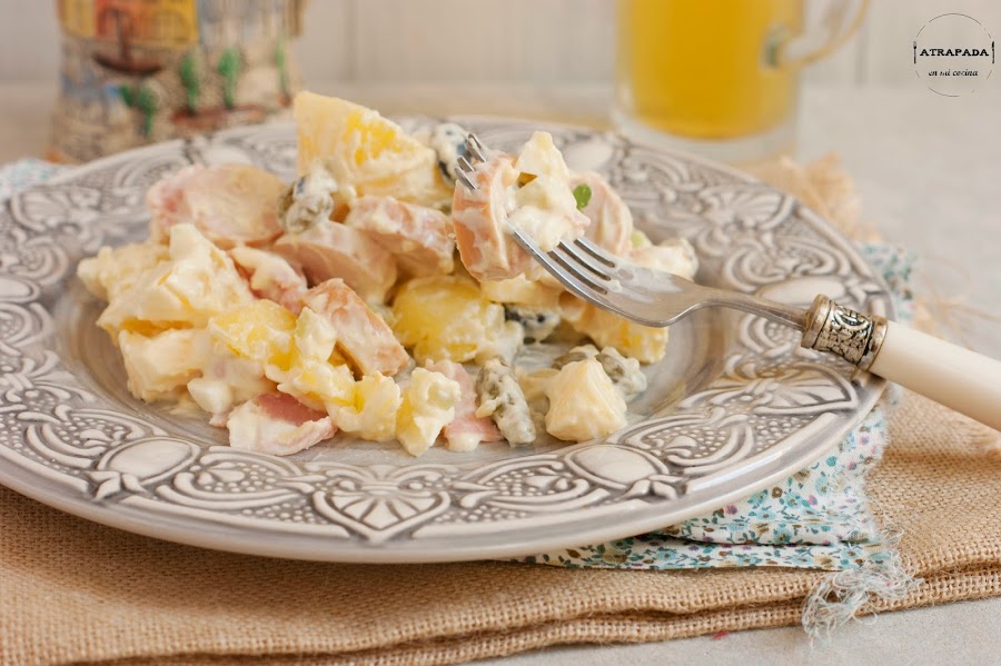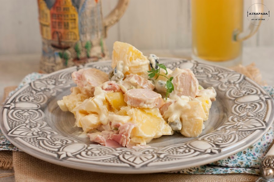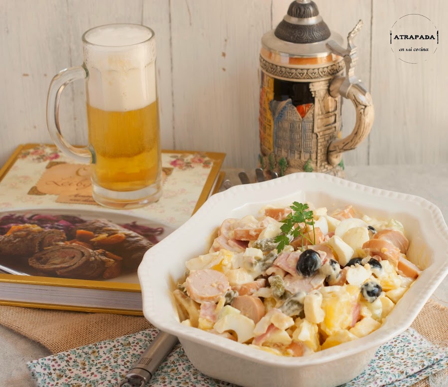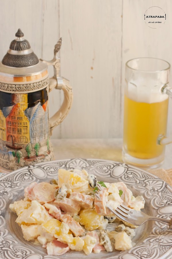 En ninguno de mi tres viajes al Alemania he probado esta ensalada tan "alemana", Y eso mismo le decía yo a Carlos cuando la publicó el año pasado. Buscando en mi libro de cocina tradicional alemana tampoco encontré la receta, por lo que finalmente me decanté por su receta. Una receta que ha triunfado en casa, y que nos ha gustado tanto que se va a convertir en habitual de nuestra cocina. Buscando un poco en la historia de esta ensalada (Kartoffelsalat) descubrimos que existen muchas variedades de ella en Alemania o Austria, siendo siempre el elemento común el de la patata. Unas veces se le acompaña de mayonesa y otras, en cambio, no. Incluso me ha llamado la atención que en algunas versiones no lleve salchicha, siendo, sin duda, éstas uno de los referentes de la cocina alemana, y además podemos aprovechar que Campofrío nos trae numerosas versiones de salchichas tipo Frankfurt. Esta versión de ensalada es muy completa en cuanto a ingredientes, ahora veréis.