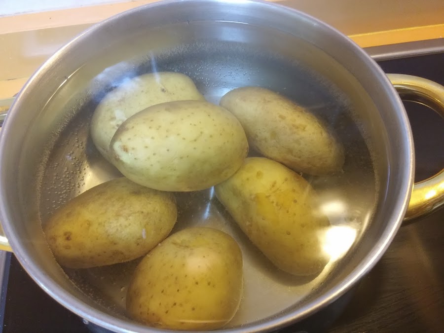 Lo primero que haremos será poner un cazo con agua y sal y cuando rompa a hervir echamos las patatas enteras y con la piel y dejamos cocer durante aproximadamente 30 minutos.