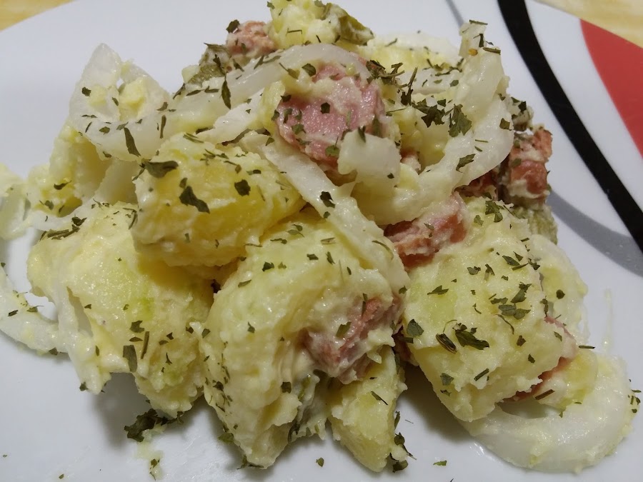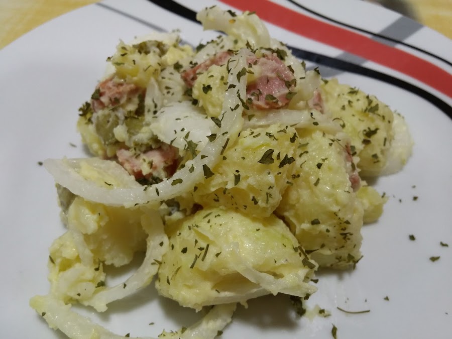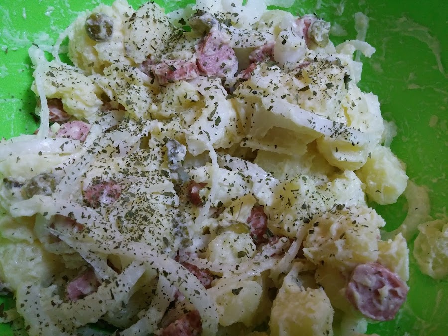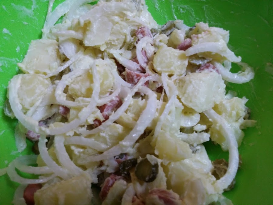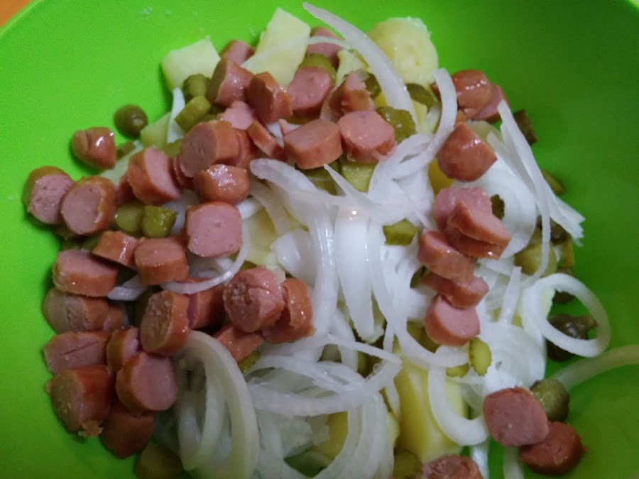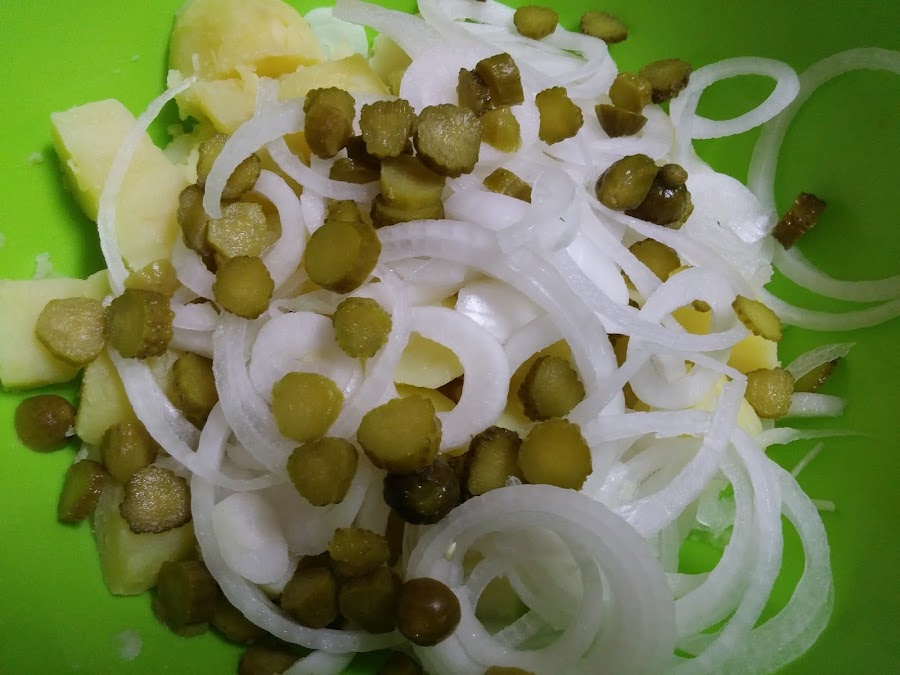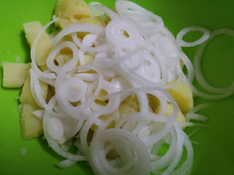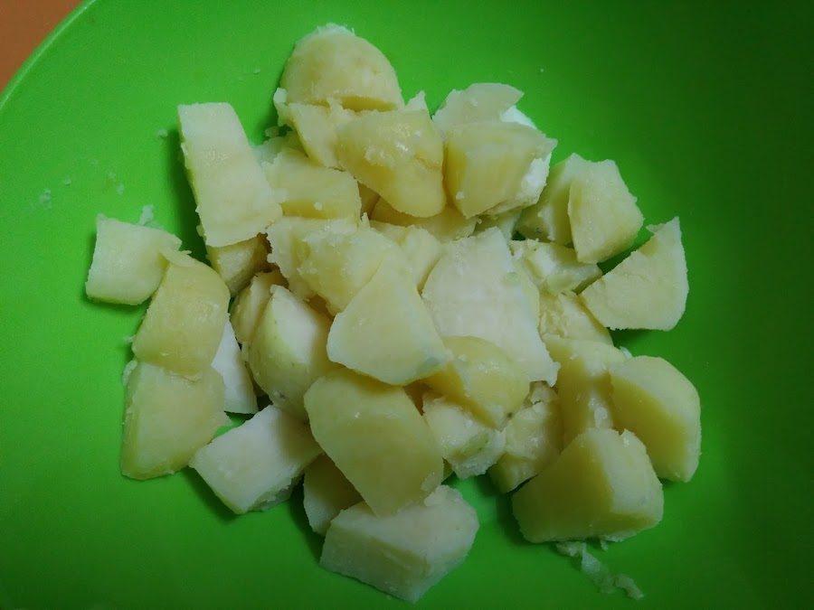 Una vez cocidas las sacamos y pelamos. Las cortamos a dados no muy pequeños y las echamos en la ensaladera o fuente. Salpimentamos.