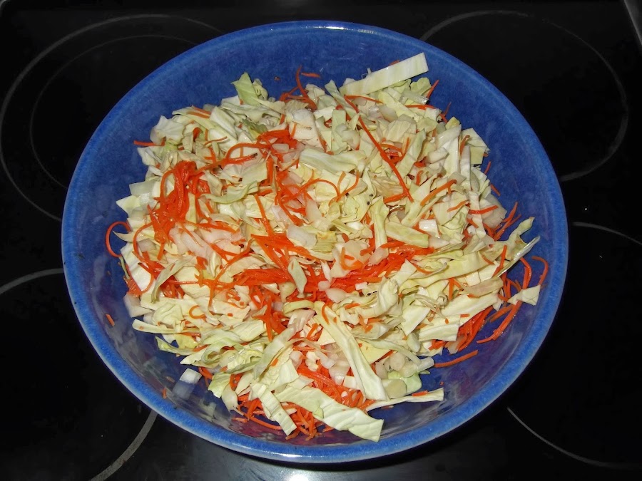 Lo primero que hacemos es cortar el repollo todo lo fino que podamos y lo colocamos en un bol, al que añadimos la zanahoria picada.
