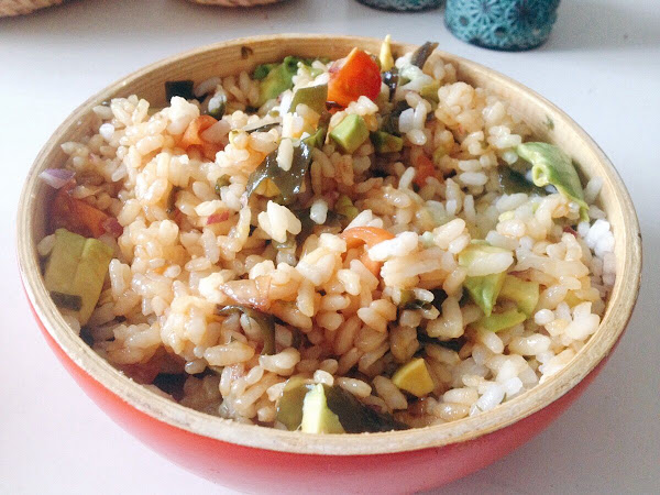 Mezclamos la cebolla, tomates, aguacate y wakame con el arroz y le añadimos la soja y wasabi al gusto