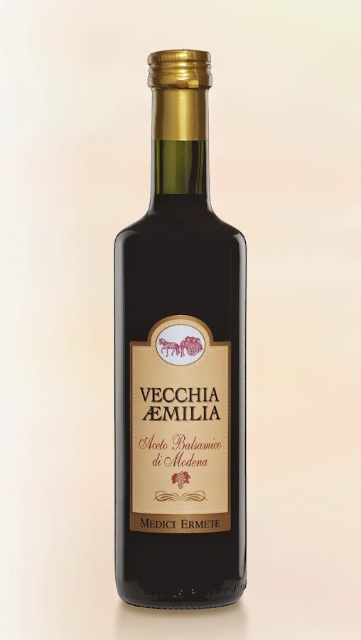 Para aderezar la ensalada he utilizado el acetato balsámico de Módena "Vecchia Aemilia" un rico y cremoso vinagre de color marrón oscuro con un exquisito sabor, una acidez increíblemente agradable y una fragancia natural distintiva. Elaborado con uvas selectas (Lambrusco y Trebbiano) crecidas en las provincias de Reggio Emilia y Módena (regiones de las que os hablaré en una futura receta de la zona). Producto puramente natural al que no se le añade ninguna especia ni potenciador de sabor. Es el condimento ideal para una cocina sana y equilibrada, excelente para el aliño de ensaladas y para la elaboración de pastas, carnes y pescados. Yo lo he comprado en el Alcampo. Os lo recomiendo.