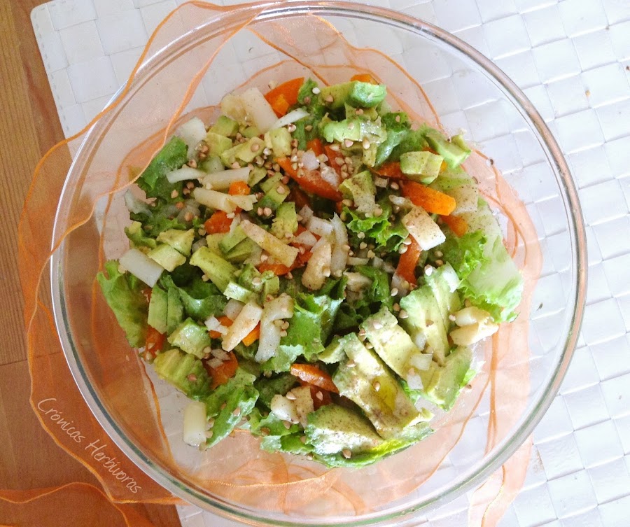 Afortunadamente ya las ensaladas en algunos restaurantes van tomando carisma y consistencia pero si no encontráis este tipo de establecimientos, yo os voy a ayudar a que la palabra ensalada cobre un nuevo significado. Puedes reemplazar la lechuga batavia por otro tipo que tengas pero preferiblemente de hoja verde. El lino, la levadura de cerveza son opcionales pero el primero aporta omega 3 y la segunda proteínas. Bueno, ¿empezamos?