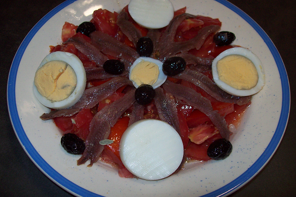 Colocar encima de este, a tu gusto, el huevo duro, las olivas y la lata de anchoas.