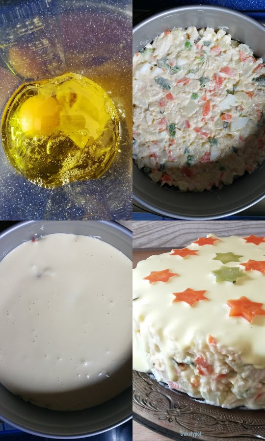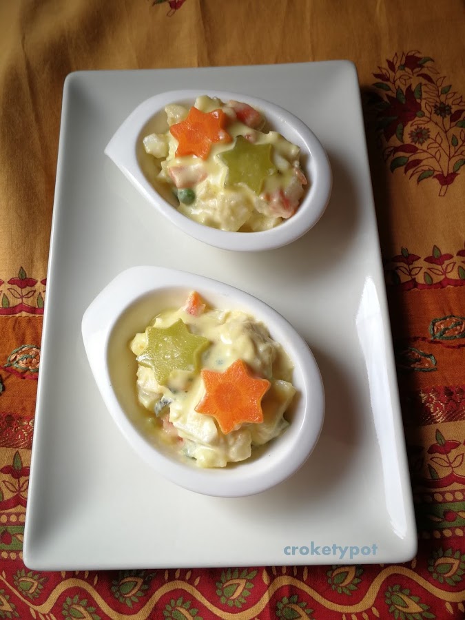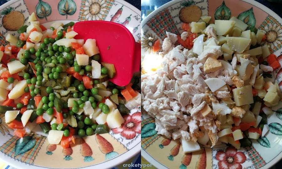 INGREDIENTES: 1 pechuga de pollo, 2 patatas, 1 zanahoria, guisantes, judías redondas, 1 huevo para cocer y otro para la mahonesa, 1 trocito de puerro (opcional), pepinillos en vinagre, mostaza, sal, limón y aceite de oliva AOVE.