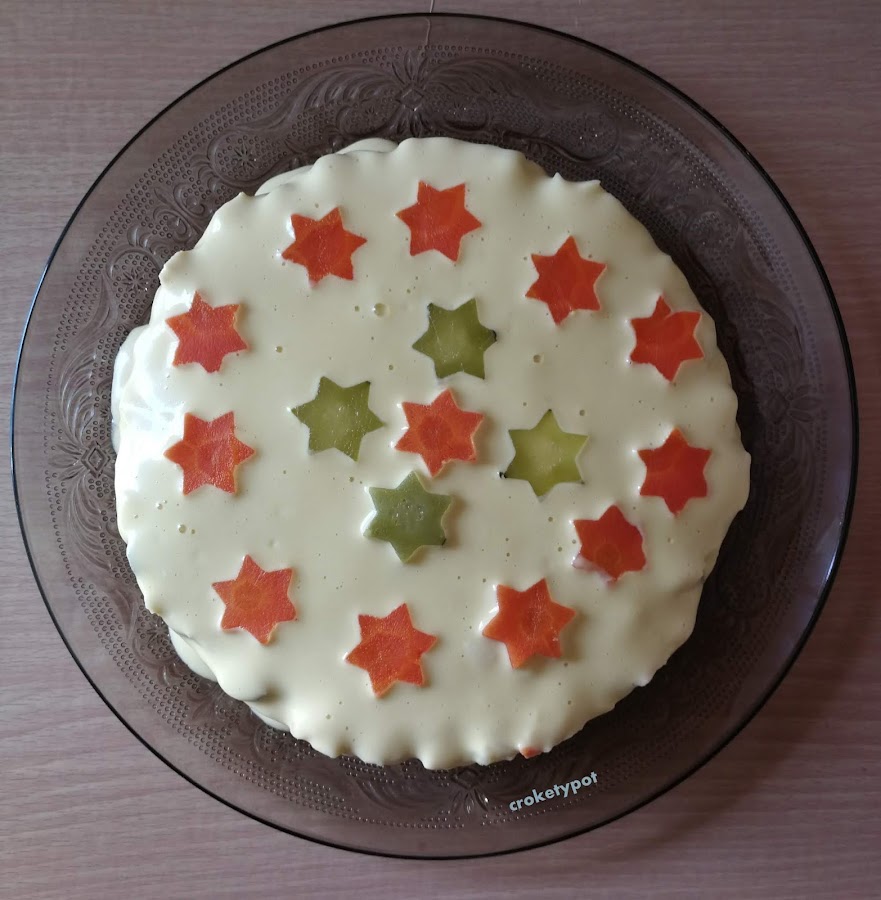 Añadimos mas de la mitad de la mahonesa a la ensalada y movemos bien, la otra la dejamos para cubrir la ensalada y la adornamos a nuestro gusto.