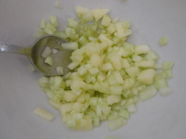 Picamos bien fino el pepino y la manzana, los mezclamos y los aliñamos con sal, aceite y limón.