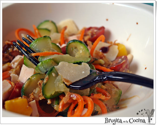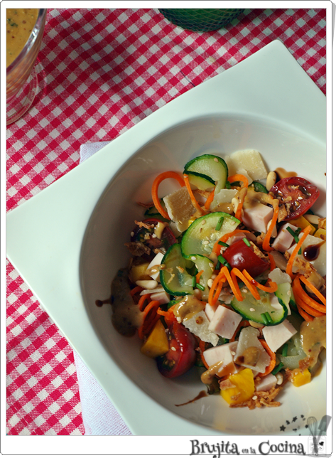 Montamos el plato una base de calabaacín, después la zanahoria, distribuimos dados de pavo, mango, los cherys y el queso.