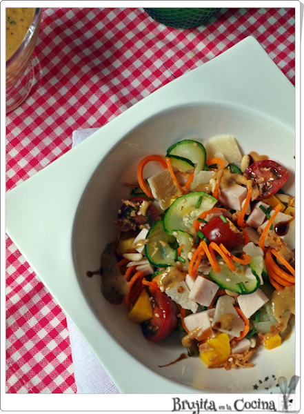Asi que teniendo en cuenta esto hoy propongo ensalada, me encanta inventar nuevas ensaladas y aliños. A veces es una ensalada un poco lo que encuentro en el frigo y otras veces la pienso y compro ingredientes acordes para la idea, la de hoy es esta segunda.