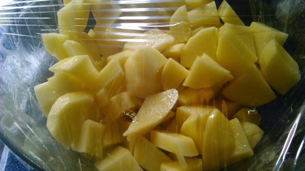 Pelamos las patatas y troceamos en cuadrados del mismo tamaño. Las ponemos en una ensaladera con una pizca de sal y las cubrimos de agua, lo justo. Tapamos con papel film y hacemos 4 ó 5 agujeros. Metemos en el microondas 15 minutos a máxima potencia y dejamos enfriar.