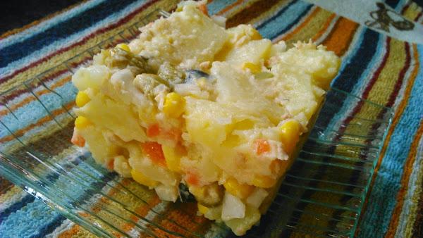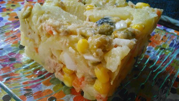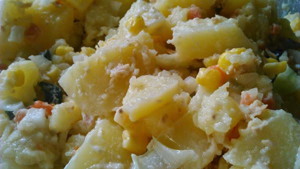 Escurrimos las patatas y le agregamos el resto de ingredientes: el queso crema, la cebolleta, el maíz enjuagado y escurrido, las aceitunas, el atún desmigado y con su aceite, el picadillo de variantes sin el líquido y mezclamos bien.