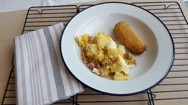 Si vas a hacer esta ensalada campera sin thermomix, pon a cocer las patatas lavada con piel y los huevos. Una vez cocidos, pela corta en rodajas finas tanto los huevos como las patatas y coloca en una fuente, junto a las aceitunas verdes y el atún. Adereza tu ensalada con mayonesa, all i oli o nuestra vinagreta de aceitunas.