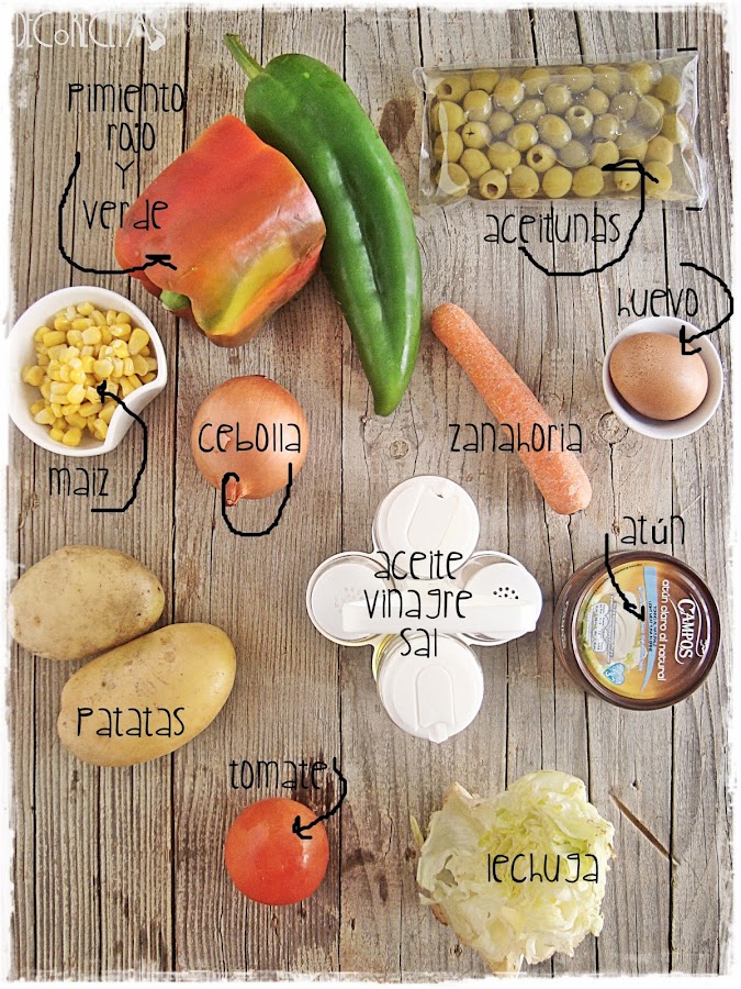 Cocemos las patatas junto con los huevos, dejamos templar, pelamos y picamos. Lo mismo haremos con el resto de ingredientes: lechuga, pimiento, tomate, cebolla y zanahoria. Añado maíz, atún, aceitunas, y aliño al gusto.