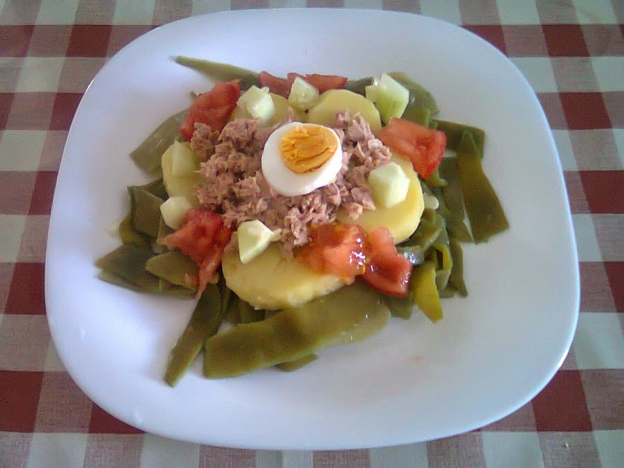 Ahora es solo mezclar los ingredientes en un bol, las judias verdes, las patatas, el huevo, el tomate y el pepino (cortados pequeños), el atún y por último la cebolla. (Ainsss creo que no me olvido de nada que me pongo a escribir... :))