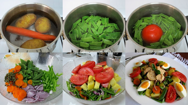 Comenzamos lavando muy bien las patatas y la zanahoria, limpiamos cualquier resto de tierra que puedan tener en la cáscara. Ponemos a cocer las patatas y la zanahoria en una olla con agua salada hasta que estén suaves. Vigilamos la cocción para que la zanahoria no quede demasiado blanda o pasada. Paralelamente, hervimos los huevos en un cazo con agua y un chorrito de vinagre, a partir del primer hervor los cocemos por 10-12 minutos dependiendo del tamaño de los huevos. Como a mí me gusta que la yema quede un poco cremosa, los he cocinado por menos tiempo (8 minutos). Al finalizar el tiempo de cocción, sacamos los huevos del agua caliente y los dejamos templar en agua fría. Entretanto, lavamos las judías, les retiramos las puntas y las cortamos a nuestro gusto. Cuando las patatas y la zanahoria estén suaves, las sacamos del agua y las apartamos en un plato para que se enfríen a temperatura ambiente. Mantenemos hirviendo el agua de la cocción de estos vegetales y cocemos las judías por 5-6 minutos. En esa misma agua caliente he escaldado el tomate por 1 minuto para quitarle la piel con facilidad. Escurrimos las judías en un colador y las dejamos enfriar a temperatura ambiente.
