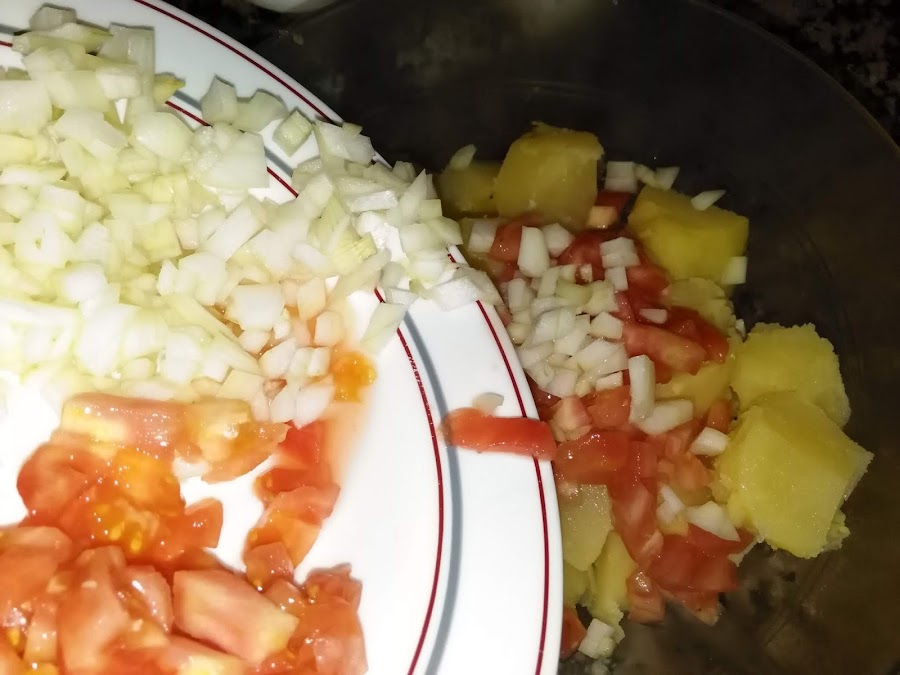 A las patatas cortadas añadimos la cebolla y el tomate que teníamos reservado