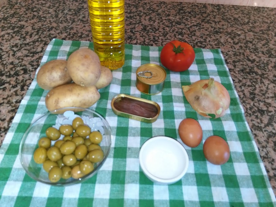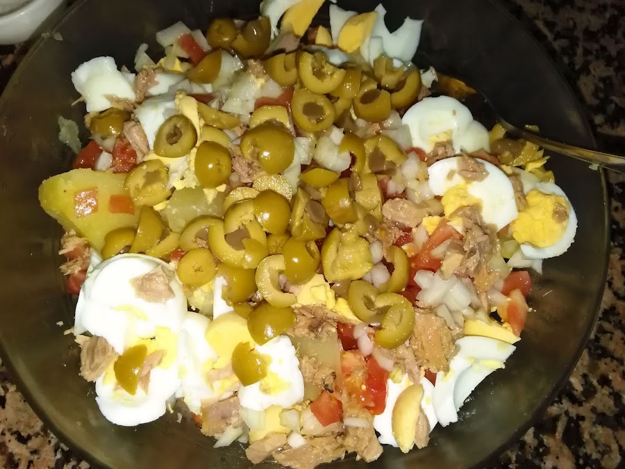 A continuación añadimos el huevo troceado, el bonito o el atún y las aceitunas cortas a la mitad, revolvemos bien todos los ingredientes