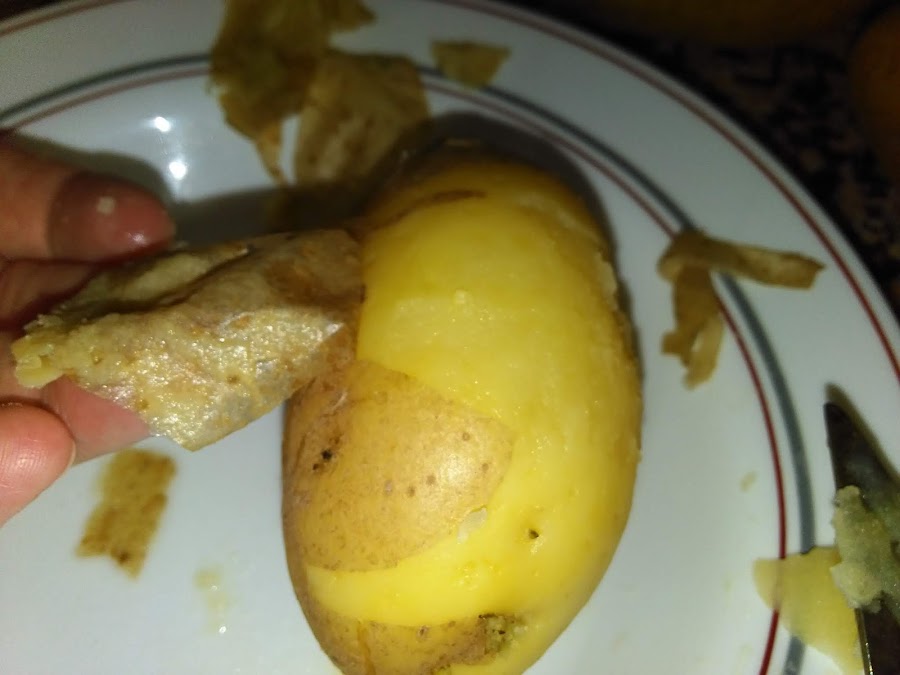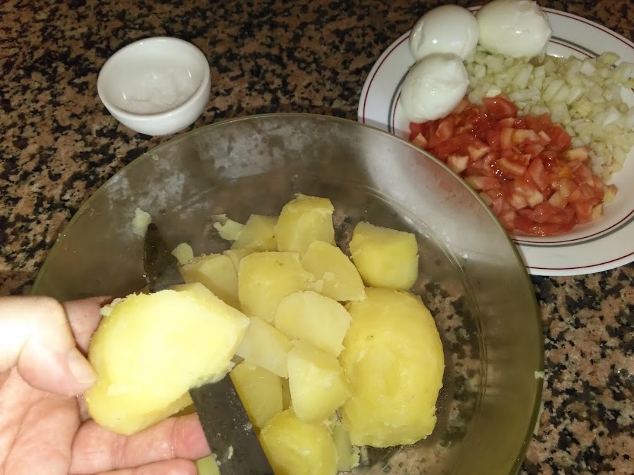 Comprobar si las patatas están cocidas con un palillo, una vez cocidas quitar el agua, dejar enfriar y quitarles la piel (sale muy fácil)