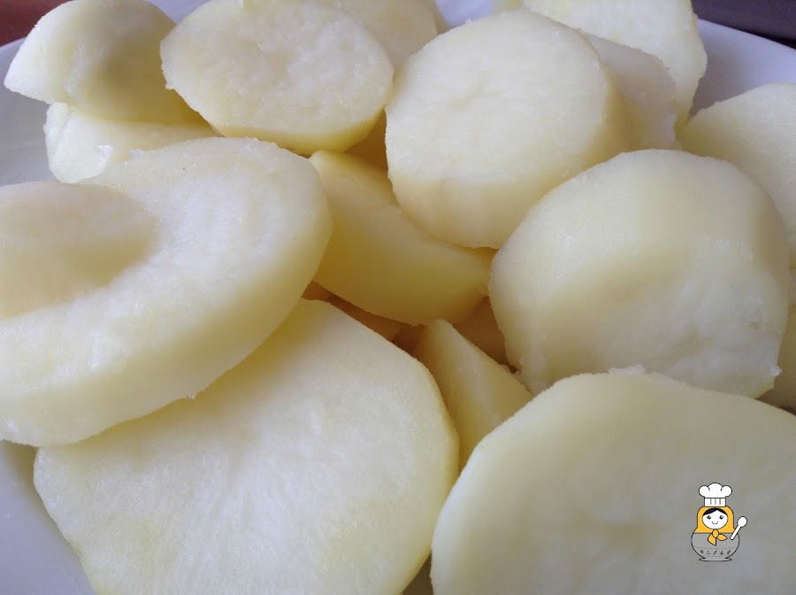 Como son lo que más tiempo nos va a llevar, primero vamos a encargarnos de las patatas. Ponemos una olla con abundante agua salada al fuego. Pelamos las patatas y las cortamos en rodajas de unos 2 cm de grosor (es importante que tengan más o menos el mismo tamaño para que tarden lo mismo en cocerse). Cuando el agua levante hervor, las echamos y en más o menos 15 minutos estarán listas (lo mejor es pincharlas con un tenedor para comprobar si no están crudas).