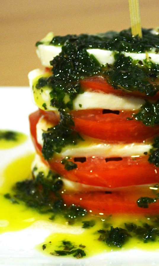Intercalaremos uno con otro (yo eché un poco de sal al tomate según lo iba poniendo). Atravesamos con un palillo para evitar que se desmonte.
