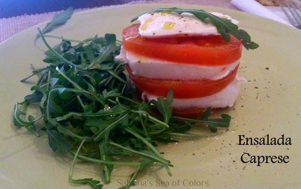 Es muy sencilla de hacer. cortamos en rodajas el tomate y la bola de queso mozzarella fresco. Disponemos el queso sobre el tomate. En la presentación de portada he hecho una torre, intercalando tomate y queso. Luego rodeamos con rúcula al gusto, añadimos un chorrito de aceite de oliva y espolvoreamos pimienta negra al gusto.