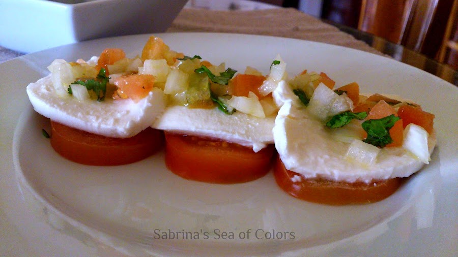 Otra opción es completar la ensalada con pico de gallo fresco. Para ello picamos bien pequeño un poco de cebolla, tomate y cilantro, mezclamos con un poco de aceite de oliva y bañamos el queso mozzarella con el resultado.