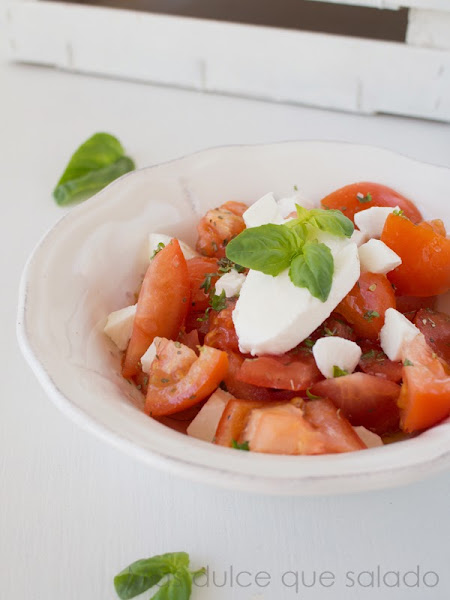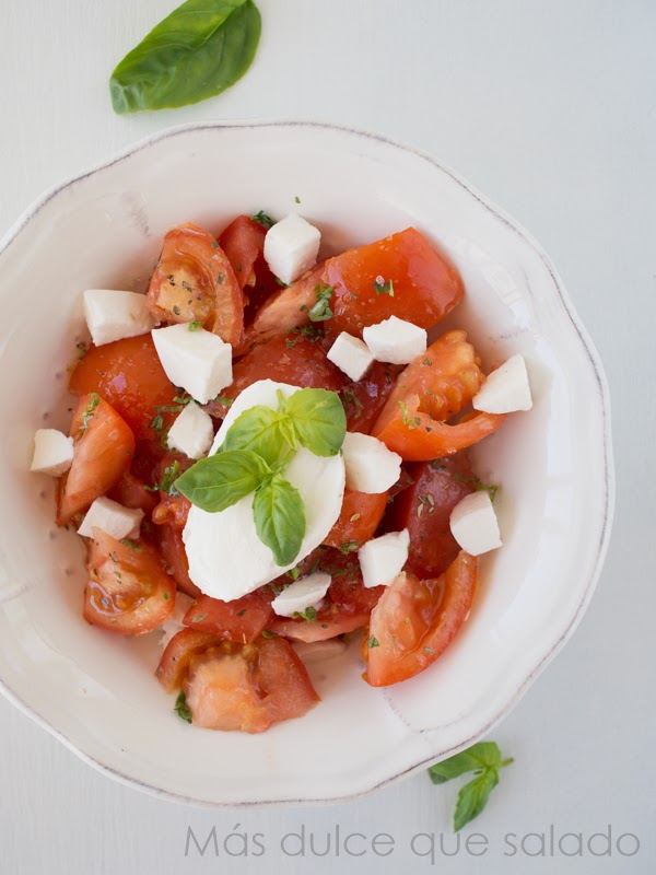 Desde hace un mes estoy totalmente enganchada a esta ensalada. La mozzarella le va divinamente pero es que la albahaca para mí es totalmente imprescindible. El aroma que desprende y el sabor que le aporta es una auténtica delicia. La primera vez que la hice compré una ramita de albahaca que me costo 1 euro y a los pocos días se puso pocha y fue al cubo de la basura, así que decidí comprar una macetita que tengo en mi terraza y que me costo tan solo 1,50 euros y tengo albahaca fresca para hacer miles de ensaladas.