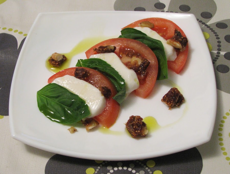 Hoy preparamos esta ligera receta de la famosísima ensalada caprese italiana, pero con el añadido de unos taquitos de pan mediterráneo hecho a base de higo, dátil, ciruela, almendra, nuez, canela y un toque de anís. ¡La combinación está riquísima!