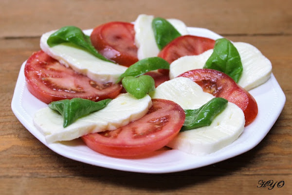 La ensalada caprese es una de las más famosas y tradicionales de Italia, concretamente de Capri. Sus vistosos colores, el rojo del tomate, el verde de la albahaca y el blanco de la mozzarella recuerdan a los colores de la bandera italiana. Podemos presentar la ensalada de diversas maneras, en forma de timbal (como he hecho yo), o bien acomodando los ingredientes sobre la superficie de un plato llano, alternando las rodajas de tomate y queso con algunas hojas de albahaca. Otra manera de presentar la ensalada es en brocheta, para ello alternaremos tomatitos cherry, perlas de mozarella y hojas de albahaca, todo ello pinchado en un palito para brochetas.