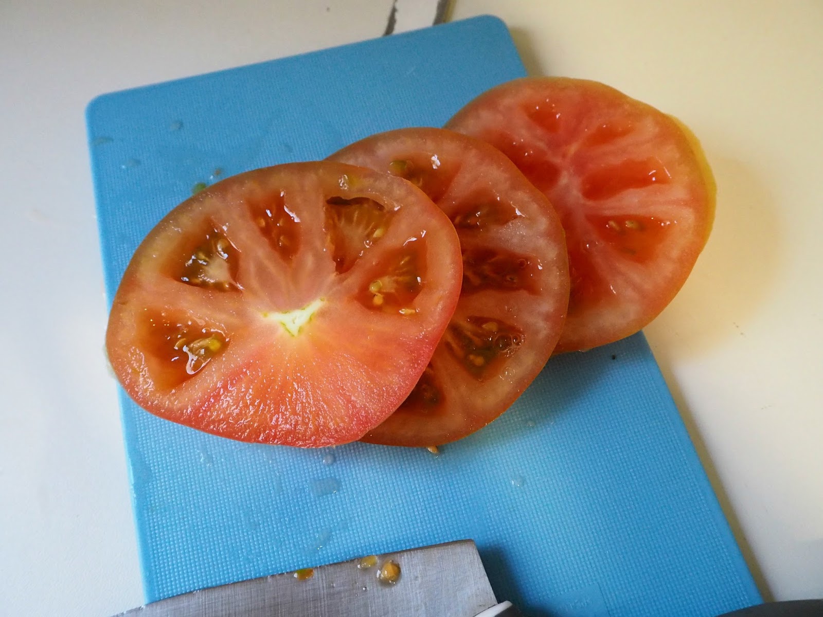 - Lavamos el/los tomate/s y los cortamos en rodajas más bien finas.