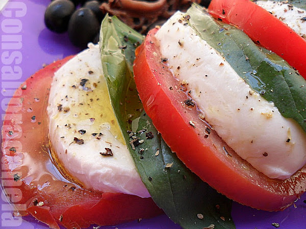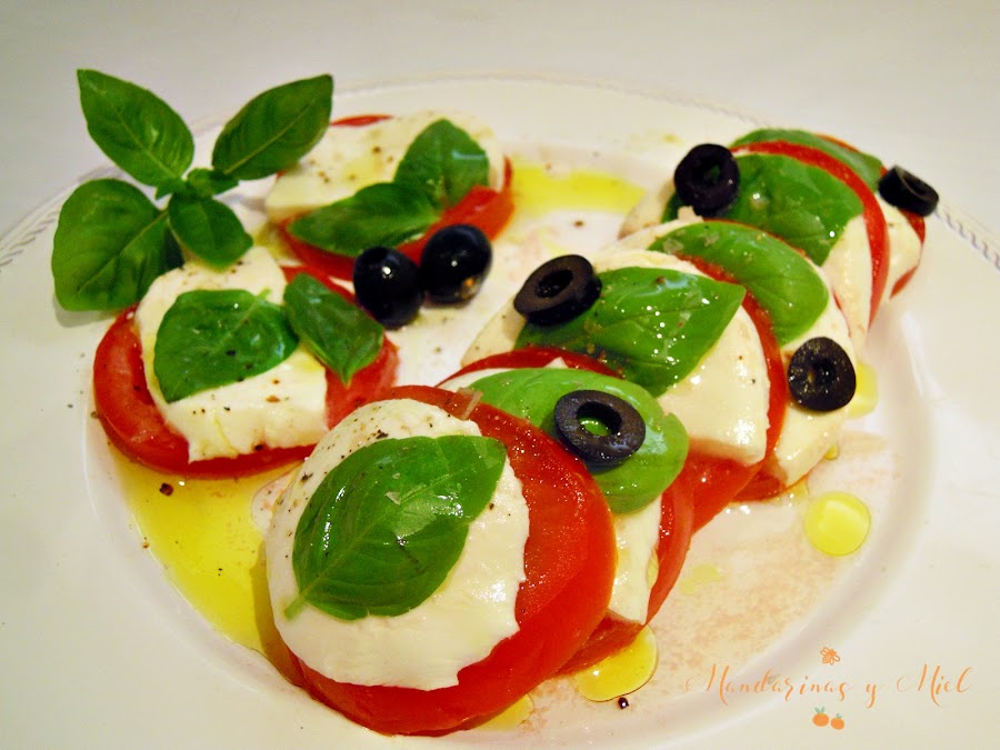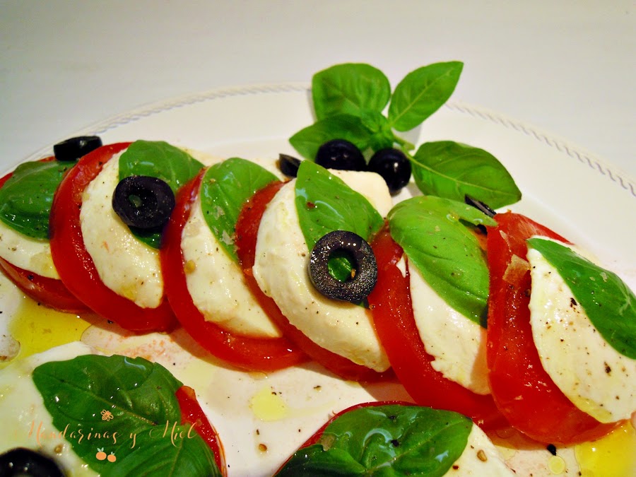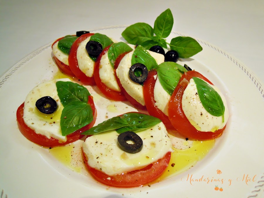 La ensalada caprese, es una ensalada italiana (concretamente de Capri), cuyos principales ingredientes son el tomate, mozzarella fresca y hojas de albahaca fresca. Todo regado con un buen aceite de oliva y espolvoreado con pimienta molida.
