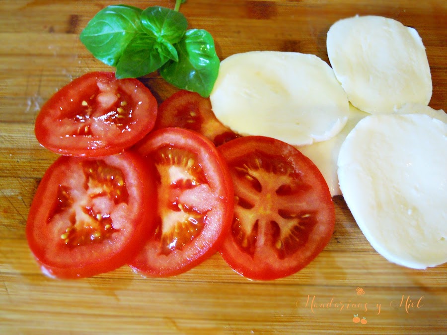 Escurre la mozarella del líquido de la bolsa y córtala también en rodajas como los tomates.
