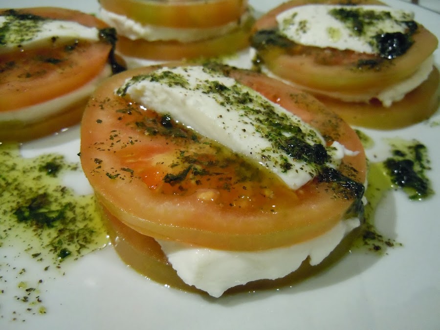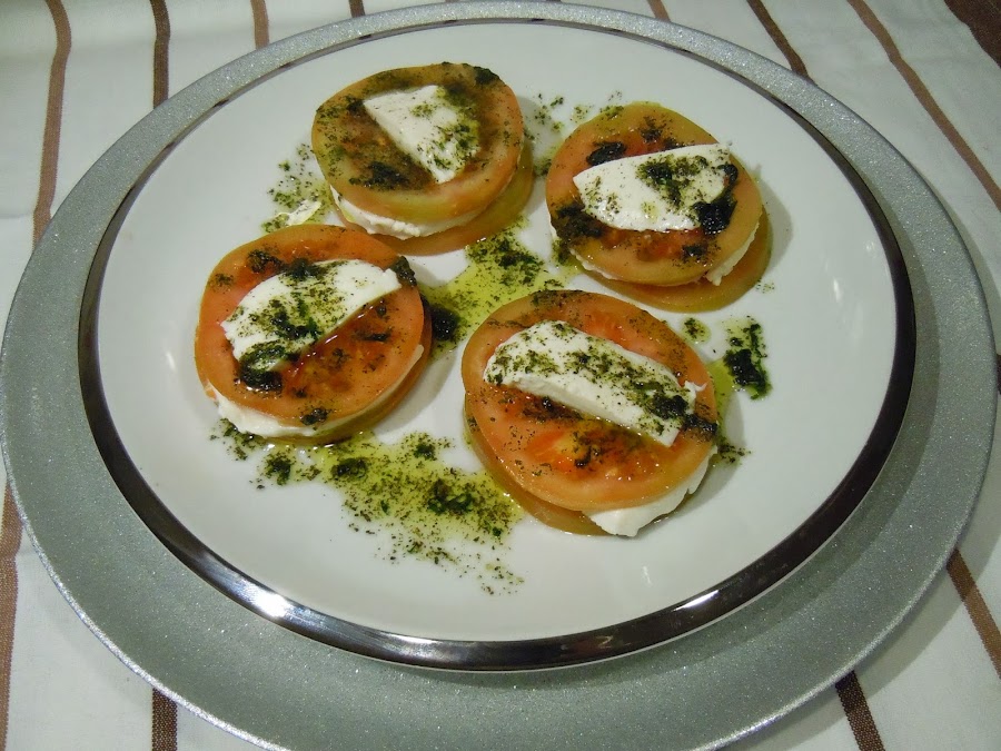 En un mortero ponemos las hierbas y las trituramos bien, añadimos poco a poco el aceite, una pizca de sal y pimienta negra al gusto. Vertemos por encima de los montaditos de tomate y mozarella y listo. En menos de 10 minutos tienes una cena de lo más original y sana. Ideal para depurar en estas fiestas navideñas.