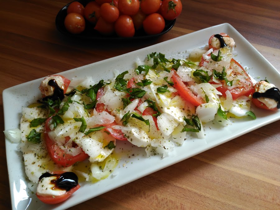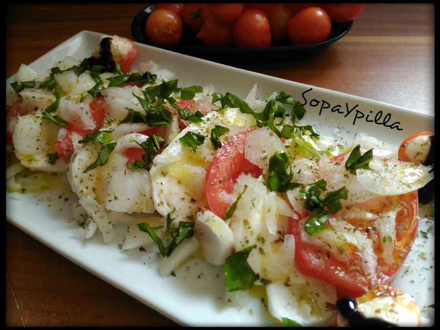 - Disponer a capas en una bandeja, alternando tomate y mozzarella