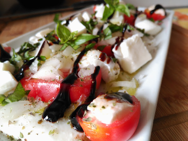 - Salar y echar un chorro de aceite, orégano, picar la albahaca por encima, y un poquito del vinagre.