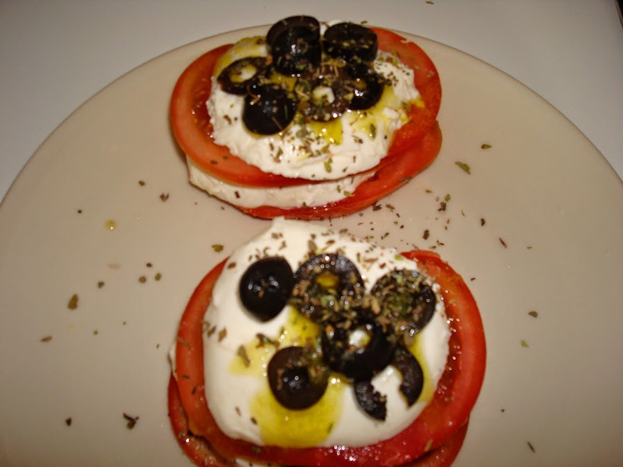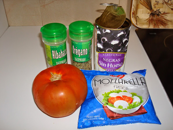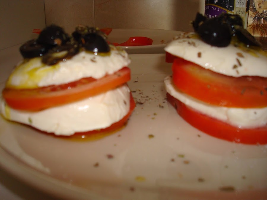 A continuación lo montamos de la siguiente manera: 1 rodaja de tomate, 1 rodaja de mozzarella, un poco de aceite de albahaca, olivas negras, orégano y albahaca y se salpimenta. Yo he montado 2 unidades.