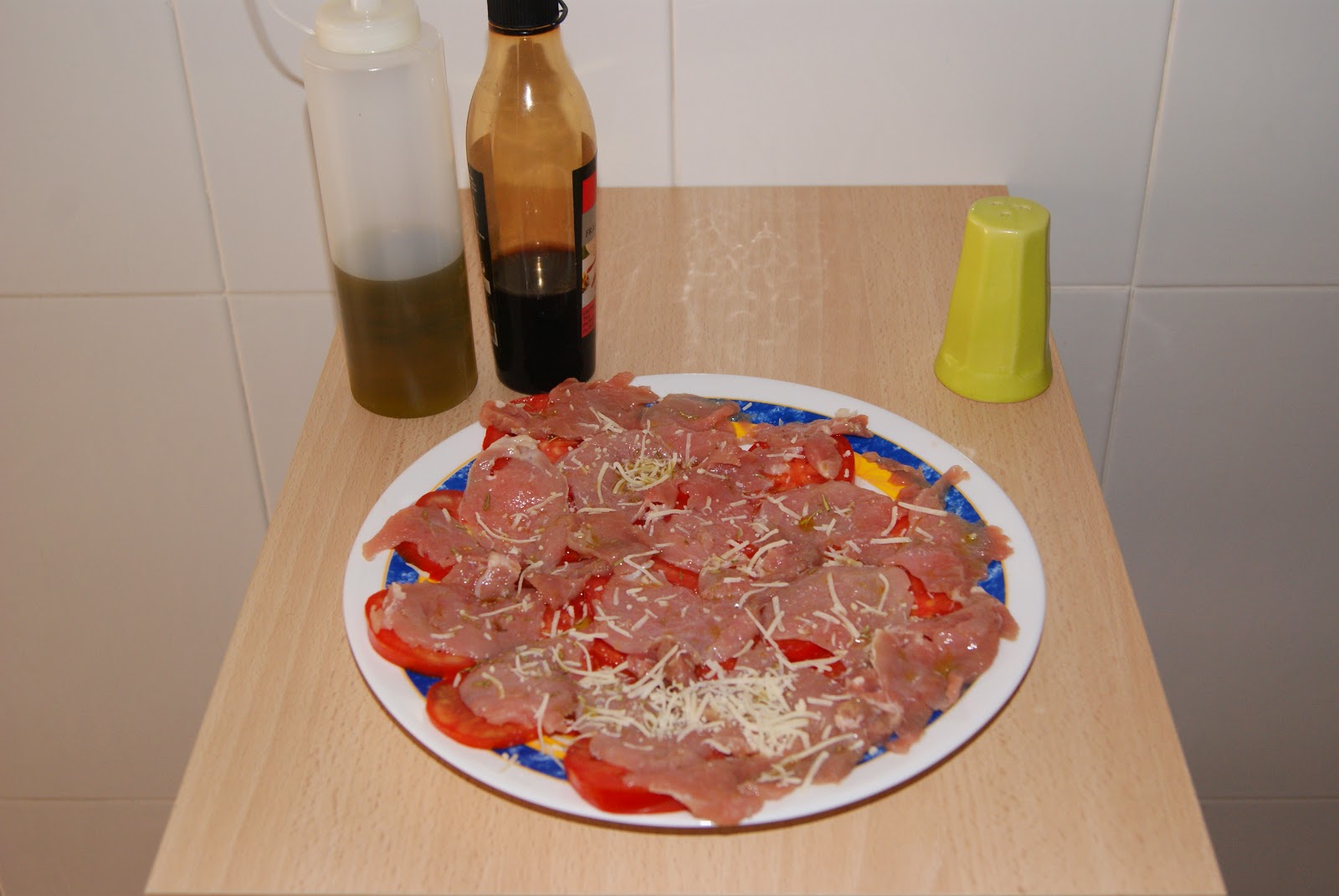 Cortamos la carne muy, muy fina, como si fueran rodajitas de embutido finas. Cortamos el tomate también en rodajas finas. Colocamos en un plato o una fuente de servicio las rodajas de tomate, y encima de cada rodaja una lonchita de carne.