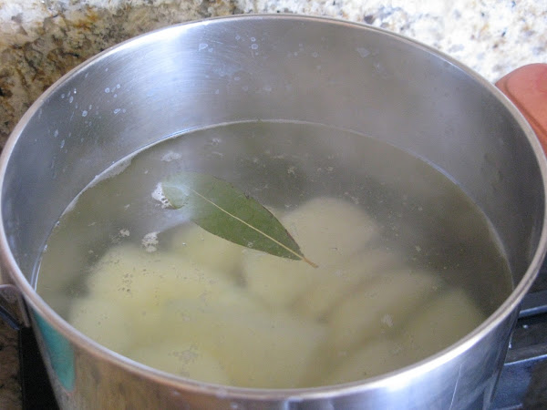 Pelar y partir las patatas en gajos grandes. Cocer en agua caliente y sal alrededor de 15 minutos, yo añado una hoja de laurel. Escurrir y dejar entibiar.