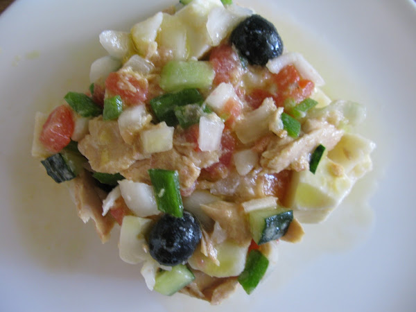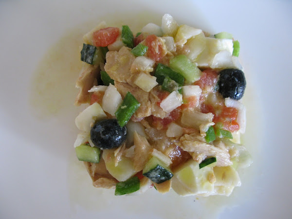 Añadir el atún, reservando el aceite para el aliño, y las aceitunas.
