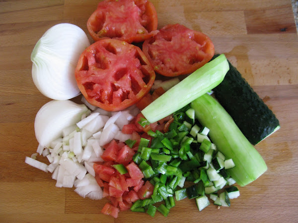 Lavar y trocear las verduras y las patatas. Suelo dejar un pepino con la piel, me gusta el toque crujiente.