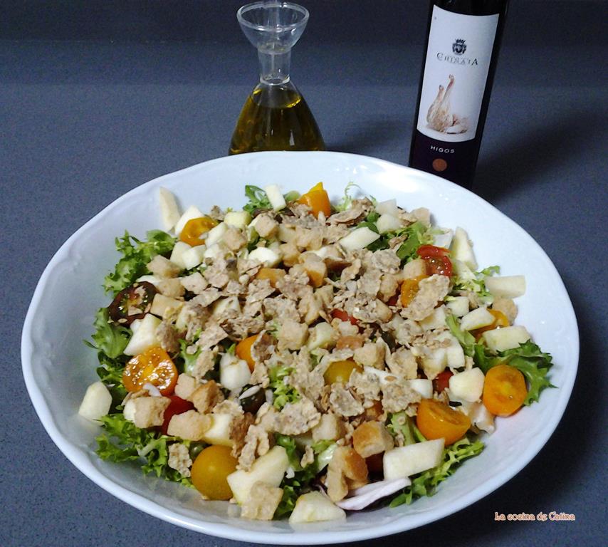 En un cuenco pequeño echamos 1/2 vasito de aceite virgen extra y cuatro cucharadas de vinagre de higos, batimos bien y rociamos la ensalada por encima.