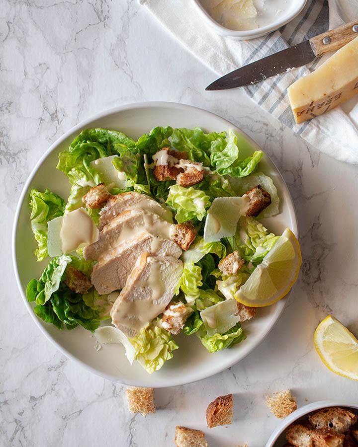 Finalmente coloca las hojas de lechuga cortadas a pedazos en el plato, encima el pan tostado cortado en cubos y añade el pollo cortado en rodajas. Por último las lascas de queso y añade la salsa César por encima.
