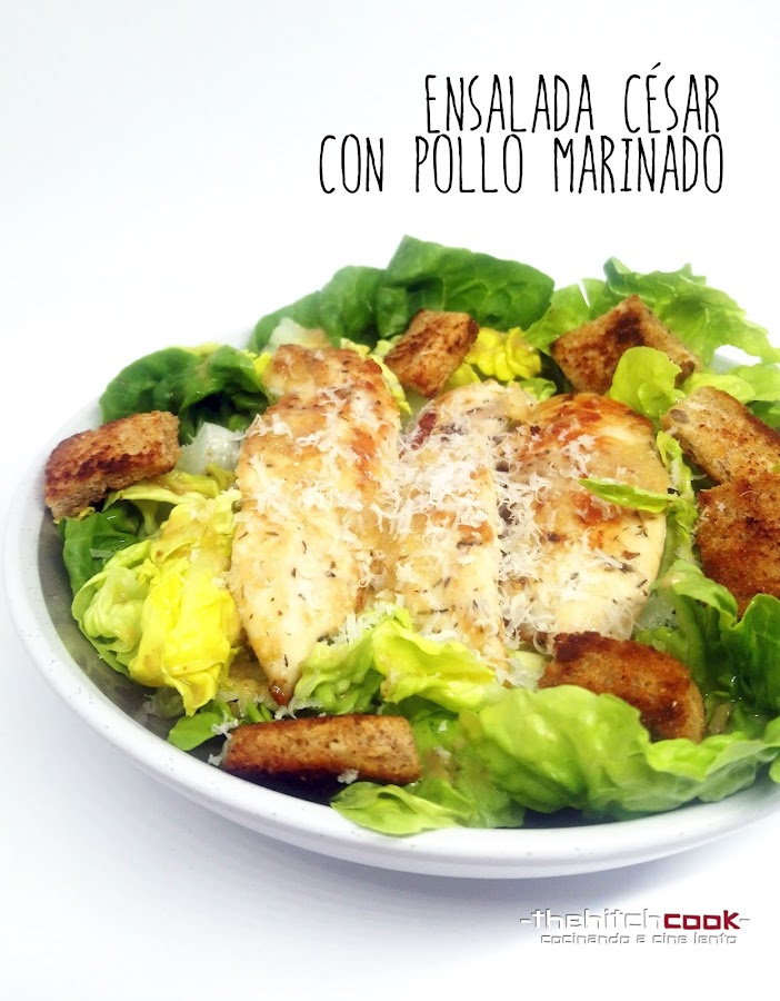 Así que sin más nos lanzamos a ejecutar esta Ensalada César con Pollo marinado. Un clásico de la cocina ya universal que ha ido evolucionando a medida que los países la iban adaptando a sus costumbres y gustos. Su origen parece fijarse en el chef Alessandro Cardini, que trabajaba en Tijuana (México) y que tuvo que inventarse esta receta para salir del paso con lo que tenía a mano. Pues eso haremos nosotros: jugar con lo que tengamos en la despensa. ¡Mandiles arriba!