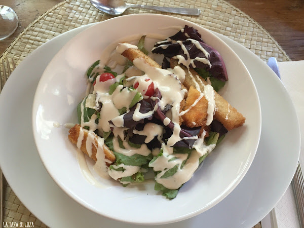 Bueno. Vamos allá. Esta ensalada lleva mucho verde, unos filetes pequeños de pechuga de pollo hechos a la plancha y rebozados con polenta (sémola de maíz) y pimentón dulce, tomates pequeños...bacon, mucho verde, anchoas y todo con unas lascas de queso parmesano.