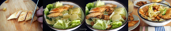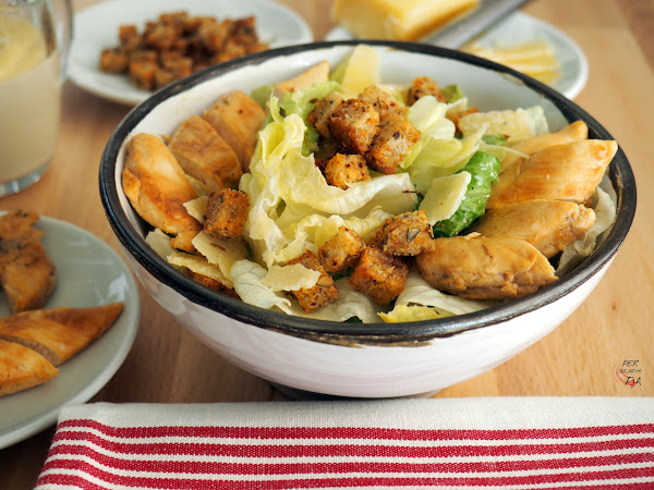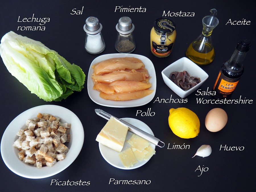 Colocar las hojas de lechuga en un bol amplio y añadir dos o tres cucharadas de la salsa, remover bien para que se reparta uniformemente. Poner una ración de lechuga en el bol o plato donde vayamos a servirla. Encima colocar un par de tiras de pollo cortado, unas virutas de parmesano y una cucharada o dos de picatostes. Servir la salsa en una salsera para que cada comensal la añada a su gusto.