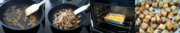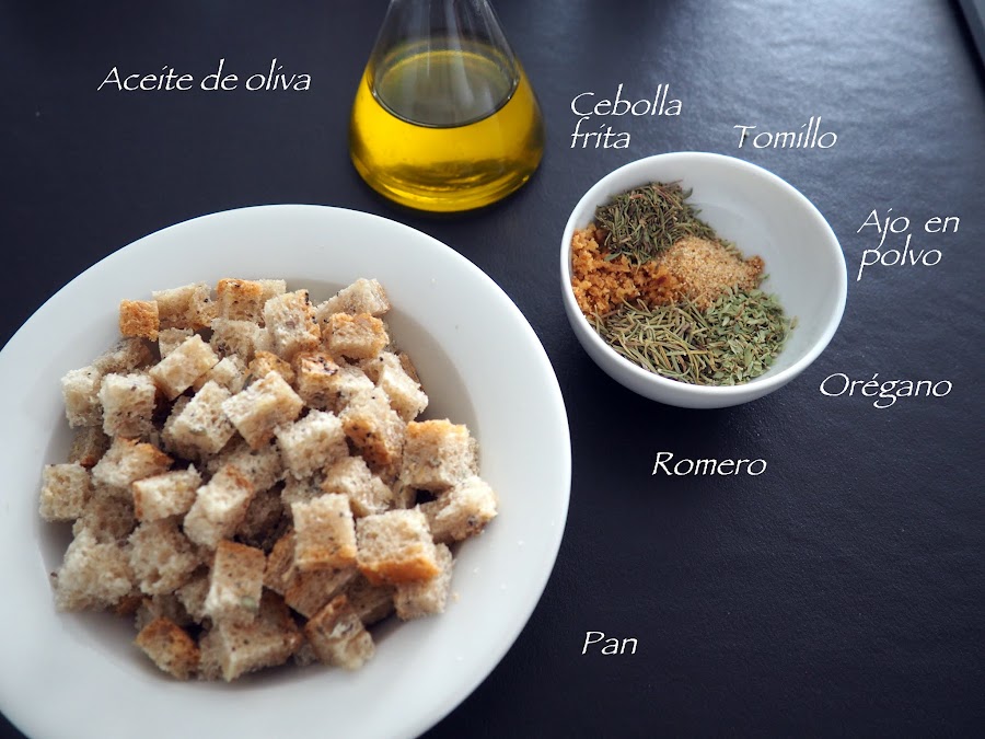 En una sartén al fuego calentar un par de cucharadas de aceite de oliva y, cuando esté caliente, tostar un minuto el aderezo: orégano, tomillo, romero, ajo en polvo y cebolla frita triturada. Incorporar los trozos de pan y mezclar bien, dejar un par de minutos al fuego y retirar.