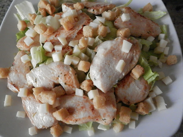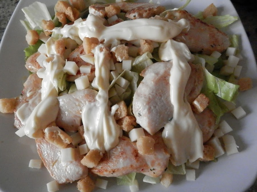 La he hecho a mi estilo, adaptando la ensalada a nuestros gustos, normalmente, esta ensalada lleva otra salsa especial que contiene entre sus ingredientes, anchoas y queso parmesano además de mostaza, nosotros hemos optado por una versión más ligera poniendo un poco de mayonesa ligera y el pollo suele ser empanado pero yo prefiero la pechuga a la plancha.