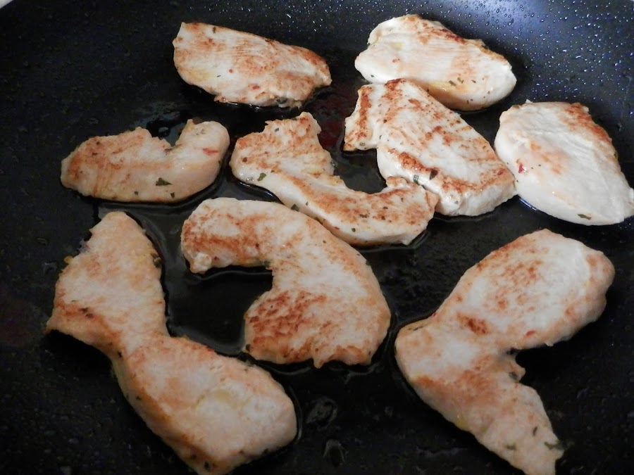 Cuando tengamos el aceite caliente, partimos en lonchas la pechuga y la hacemos a la plancha