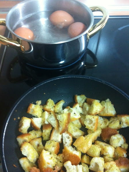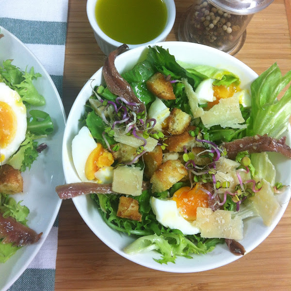Se pone encima de la lechuga el huevo partido en 4 trozos, los picatostes,4 anchoas por persona y unas lascas de parmesano recién laminado con un pelador de hortalizas.