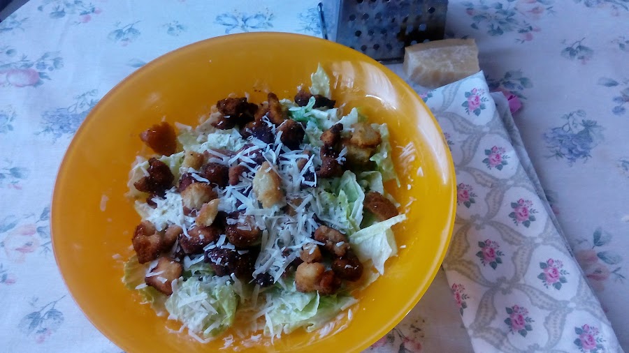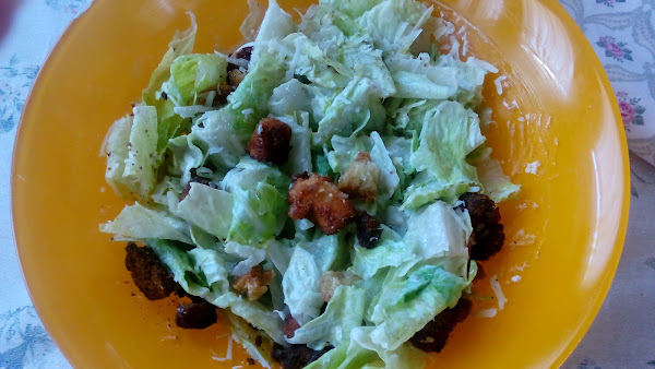 Poner en una fuente la lechuga. Regar con la salsa césar y revolver. Poner el pollo, el pan y rallar queso encima.